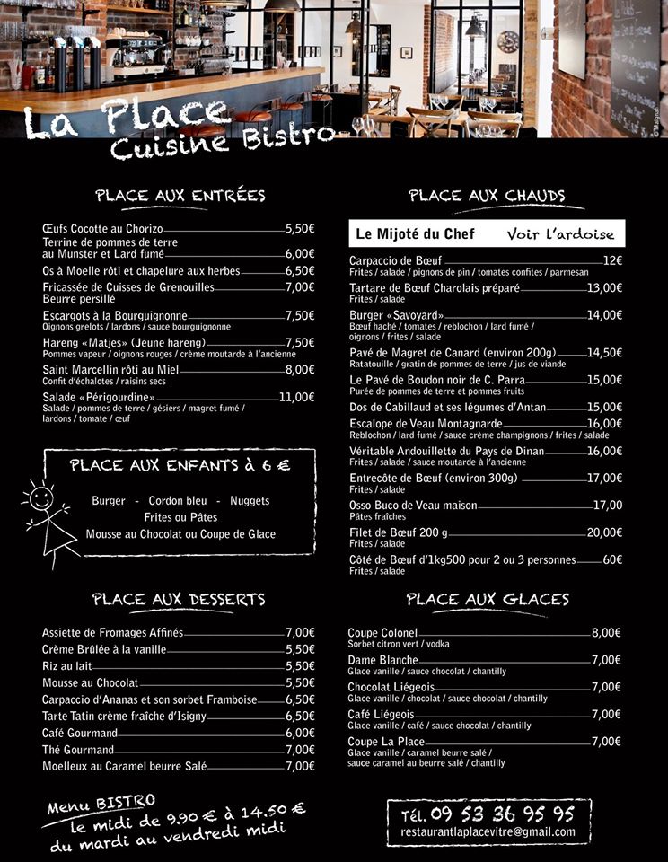 Welcome to Restaurant La place, located in the picturesque setting of 8 Pl. du Chateau, Vitre, France. This charming eatery offers a menu that, while small, is bursting with flavor and quality. Each dish reflects a commitment to excellent culinary standards, making every bite a delightful experience.